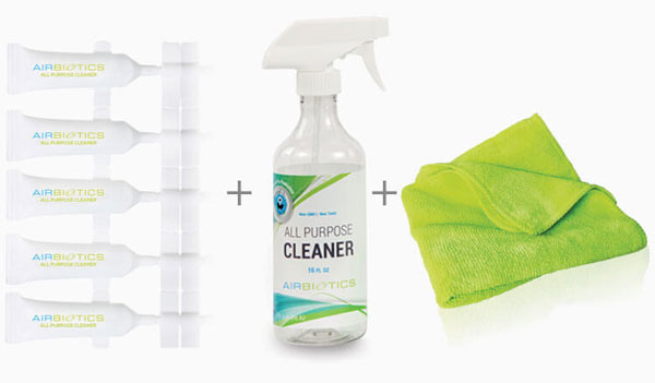 Enter your email and sign up to get a Free Airbiotics All Purpose Cleaner Sample Kit that Includes 5 individual tubes (5 ml each) of concentrated Airbiotics All Purpose, Cleaner refills — This kit makes five spray bottles of our All Purpose Cleaner, 1 reusable 16-ounce spray bottle — This is the perfect size for all purpose cleaning, 1 microfiber cleaning cloth — Reusable, washable, lint-free, and amazing!