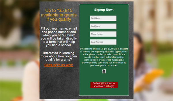 Users looking for financial aid and to go back to school can fill out their name, email and phone number, and when the “Submit” button is hit, taken directly to a form that will help them find a school.
