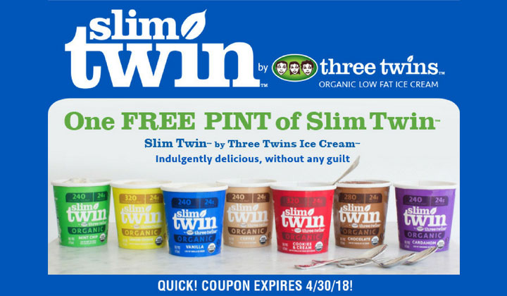 Just fill out the form (or print the coupon directly here) to get a coupon for Free Pint of Slim Twin by Three Twins Ice Cream. It expires on 4/30/18.